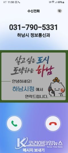 코리아타임뉴스 기동취재팀 | 하남시는 공무원 행정전화 발신 시, 시민의 스마트폰 화면에 ‘하남시청 과’ 등 전화번호와 부서명이 함께 표시되는 ‘행정전화 발신정보 알리미 서비스’를 도입했다고 7일 밝혔다.