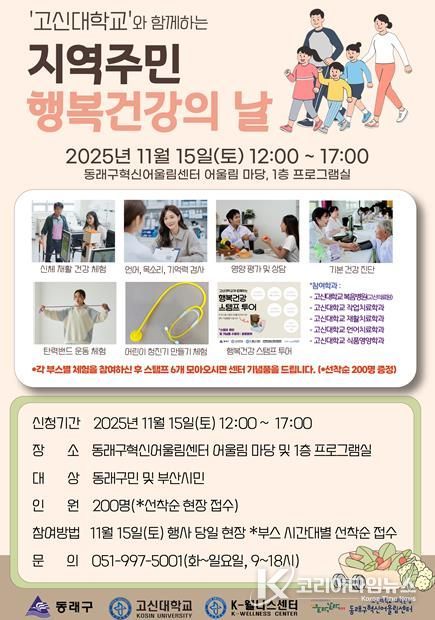 코리아타임뉴스 부산취재본부 | 부산 동래구는 오는 11월 15일 낮 12시부터 동래구 혁신어울림센터(동래구 금강로 129) 1층 어울림 마당에서 고신대학교와 함께 ‘지역 주민 행복 건강의 날’ 행사를 개최한다고 밝혔다.