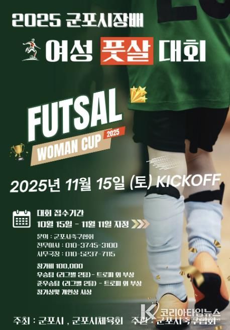 코리아타임뉴스 이아름 기자 | 군포시는 여성 생활체육 참여 확대와 건전한 스포츠 문화 확산을 위해 ‘2025 군포시장배 여성 풋살대회’를 오는 11월 15일(토) 군포시 국민체육센터 축구장에서 개최한다.