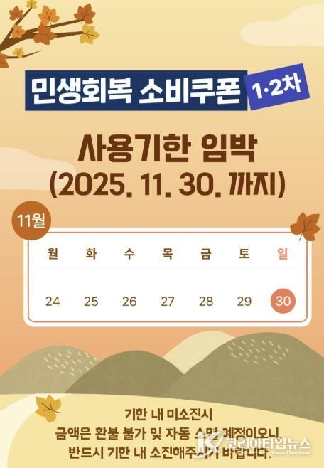 코리아타임뉴스 기동취재팀 | 가평군은 주민생활 안정과 지역경제 활성화를 위해 지급된 ‘민생회복 소비쿠폰’의 사용기한이 오는 11월 30일로 종료된다며, 군민들에게 기한 내 적극적인 사용을 당부했다.