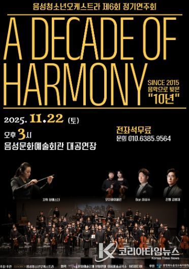 코리아타임뉴스 사회팀 | 충청북도음성교육지원청의 방과후학교 민간공모사업 운영 단체인 음성청소년오케스트라(지휘 장에스더)가 창단 10주년을 맞이하여 오는 11월 22일 오후 3시, 음성문화예술회관 대공연장에서 제6회 정기연주회 ‘A DECADE OF HARMONY’를 개최한다.