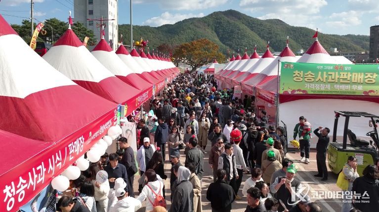 코리아타임뉴스 경북취재본부 | 청송군은 지난 10월 29일부터 11월 2일까지 열린 제19회 청송사과축제에서 지역민과 방문객의 뜨거운 호응 속에 사과 판매부스 총 매출액 약 10억 원 이상을 기록하며 역대 최대 판매 실적을 달성했다고 밝혔다.