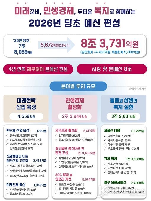 본예산은 특별회계 포함 처음으로 8조 원을 넘었으며, 이는 지방세와 보통교부세의 증가뿐만 아니라 국비 확보 노력의 결과로, ① 미래전략산업 육성 ② 민생경제 회복 ③ 돌봄과 상생의 복지 실현, 3대 분야에 집중 투입된다.