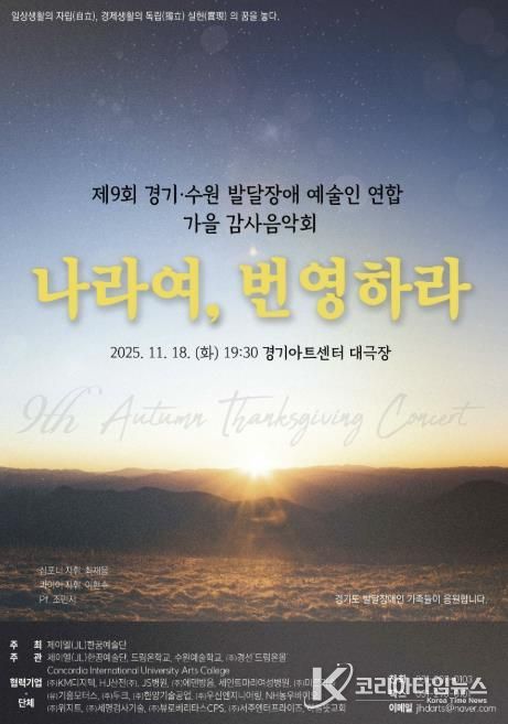 코리아타임뉴스 이아름 기자 | “나라여, 번영하라”, 우리나라의 안정과 번영을 기원하는 뜻으로 2025년 11월 18일 19시 30분, 경기아트센터 대극장에서 경기.수원 발달장애 예술인들이 연합으로 제9회 가을 감사음악회를 개최한다.