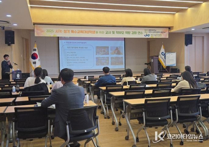 코리아타임뉴스 사회팀 | 제주시교육지원청 특수교육지원센터는 7일 제주시교육지원청 대회의실에서 제주시 관내 특수교사와 일반교사, 보호자 등 32명을 대상으로 ‘시청각 특수교육대상학생을 위한 교사 및 학부모 역량 강화 연수’를 실시했다.