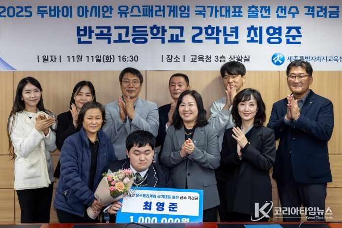 코리아타임뉴스 사회팀 | 세종특별자치시교육청은 반곡고등학교 2학년 최영준 학생이 12월 7일부터 14일까지 아랍에미리트 두바이에서 열리는 ‘두바이 2025 Asian Youth Para Games(아시안 유스패러게임)’ 뇌병변장애(F33) 원반던지기 종목에 국가대표로 출전함에 따라 함께 축하하고 격려했으며, 지원금 100만 원을 전달했다고 밝혔다.