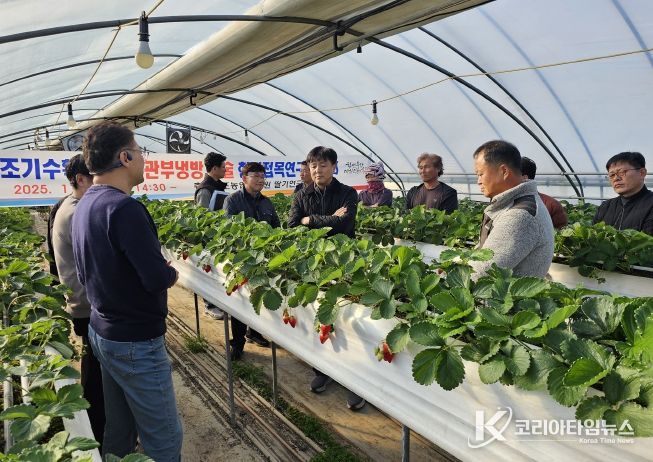 코리아타임뉴스 오영주 기자 | 충남도 농업기술원은 11일 논산시 현장접목연구 실증농가에서 딸기 농가의 소득증대를 위한 ‘딸기 조기정식 후 관부냉방 기술 현장평가회’를 개최했다.