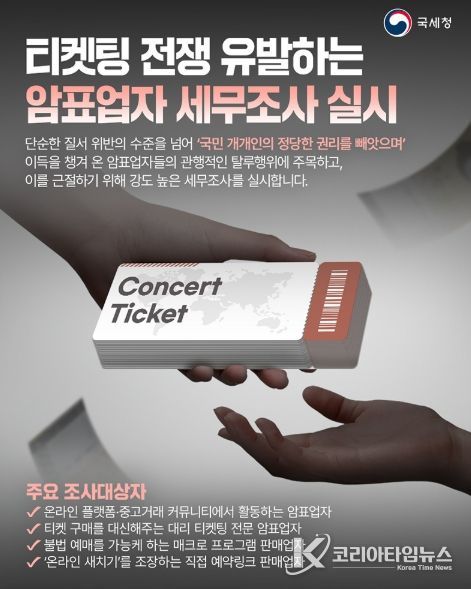 코리아타임뉴스 윤광희 기자 | 단순한 질서 위반의 수준을 넘어 '국민 개개인의 정당한 권리를 빼앗으며' 이득을 챙겨 온 암표업자들의 관행적인 탈루행위에 주목하고, 이를 근절하기 위해 강도 높은 세무조사를 실시합니다.