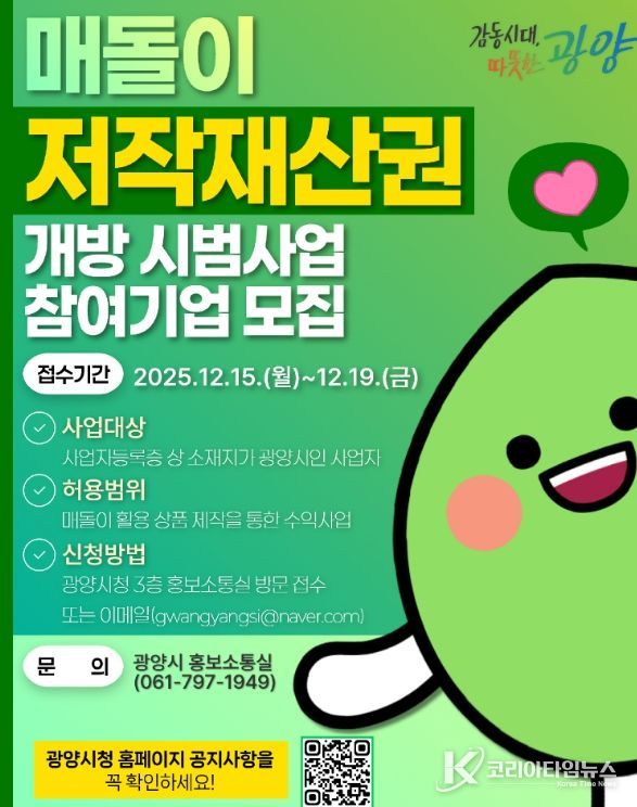 코리아타임뉴스 전남취재본부 | 광양시는 대표 캐릭터 ‘매돌이’를 활용해 다양한 상품을 제작·판매할 수 있는 관내 기업 최대 3곳을 모집한다고 12일 밝혔다.