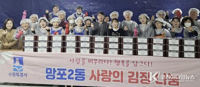 코리아타임뉴스 사회팀 | 수원시 영통구 망포2동은 지난 13일 망포2동 행정복지센터에서 2025 이웃사랑 김장 나눔 행사를 진행했다. 망포2동 새마을문고가 주관하고 망포2동 단체협의회가 후원하여 진행한 김장 나눔 행사에서 10여 명의 인원이 모여 김장 김치를 담갔다.