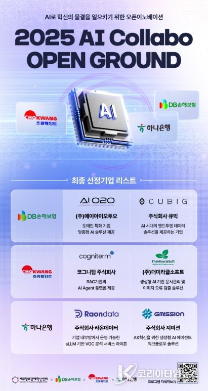 코리아타임뉴스 박찬식 기자 | 제주창조경제혁신센터(대표이사 이병선, 이하 제주센터)는 DB손해보험, 조광페인트, 하나은행과 함께 추진하는 특화산업 오픈이노베이션 ‘2025 AI 콜라보 오픈그라운드 프로그램’을 통해 최종 6개 스타트업을 선정하고, 기술 테스트와 솔루션 개발을 통해 실질적인 사업화 협력에 나선다.