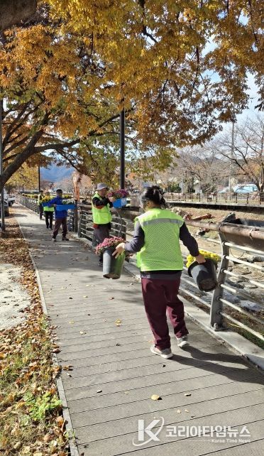 코리아타임뉴스 충남취재본부 | 금산군은 계절 변화에 따라 금산천 및 금천대교 꽃길화분을 철거했다.