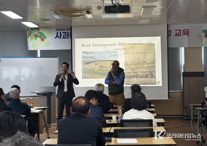 이번 교육은 지역 사과 재배 농가 50명을 대상으로 뉴질랜드 사과 재배 전문가 마크 에릭슨(Waima Orchard 대표) 박사를 초청해 진행됐으며, 해외 선진기술을 접목해 장수사과의 생산성 향상과 재배 체계 고도화를 도모하기 위해 마련됐다.