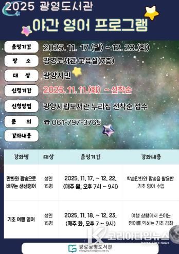수강 신청은 오는 11월 17일 오전까지 광양시립도서관 누리집에서 가능하다.