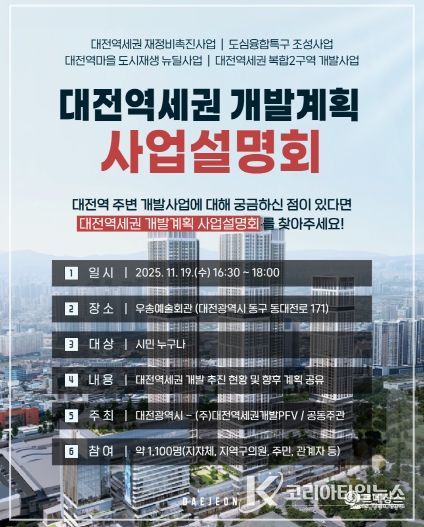 이번 설명회는 대전시와 ㈜대전역세권개발PFV 공동주관으로 개최되며, 대전역세권 개발계획의 주요 내용과 추진 현황, 향후 일정 등을 주민들에게 공유하고 원도심의 미래 비전을 소개하는 시간으로 진행될 예정이다.