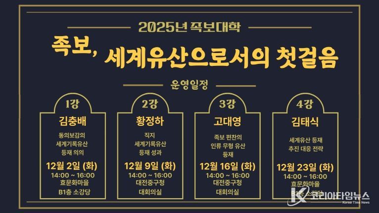 코리아타임뉴스 대전취재본부 | 대전 중구는 오는 12월 2일부터 23일까지 매주 화요일, 총 4회에 걸쳐 2025 족보대학 ‘족보, 세계유산으로서의 첫 걸음’프로그램을 운영한다고 밝혔다.