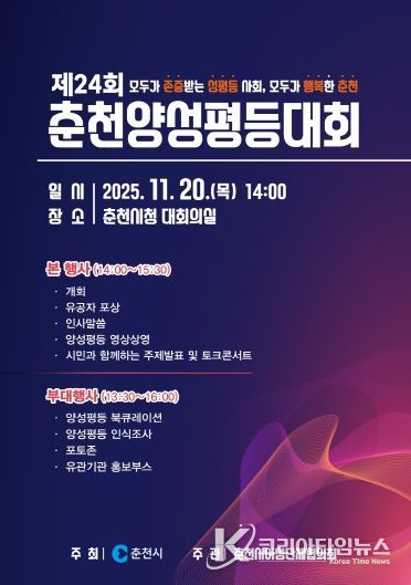 코리아타임뉴스 이아름 기자 | 춘천시가 주최하고 춘천시여성단체협의회가 주관하는 ‘제24회 춘천양성평등대회’가 20일 오후 2시 시청 대회의실에서 열린다.