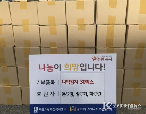 코리아타임뉴스 사회팀 | 수원시 영통구 망포1동행정복지센터는 지난 17일, 망포1동 주민 3명이 저소득 취약계층을 위해 나박김치 30박스를 후원했다고 밝혔다.