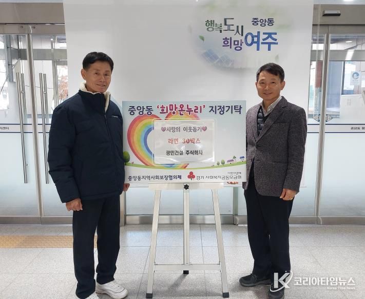 코리아타임뉴스 기동취재팀 | 여주시 중앙동 소재 광민건설㈜은 지난 18일 동 행정복지센터를 방문해 관내 저소득 취약계층을 위한 라면 30박스를 기탁했다.