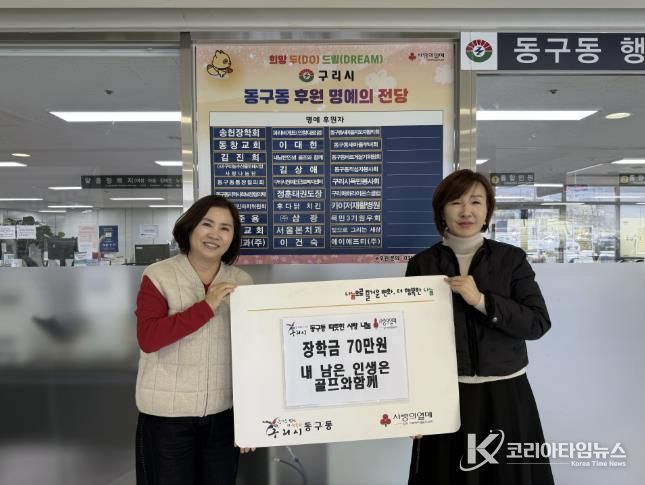 코리아타임뉴스 경기취재본부 | 구리시 동구동 행정복지센터는 지난 18일 동구동 행정복지센터 대회의실에서 '내 남은 인생은 골프와 함께' 모임으로부터 관내 취약계층 청소년을 위한 장학금 70만 원을 기탁받았다고 밝혔다.