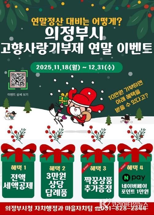 코리아타임뉴스 기동취재팀 | 의정부시는 연말을 맞아 고향사랑기부제 참여를 확대하기 위해 다양한 혜택을 제공하는 ‘고향사랑기부제 연말 이벤트’를 진행한다.