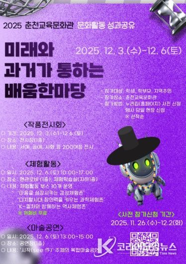 코리아타임뉴스 사회팀 | 춘천교육문화관은 12월 3일부터 12월 6일까지 ‘미래와 과거가 통하는 배움한마당’이라는 주제로 문화활동 성과공유 행사를 운영한다.