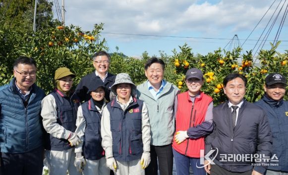코리아타임뉴스 오영주 기자 | 오영훈 제주특별자치도지사가 20일 오후 서귀포시 남원읍 위미리 온주밀감 수확 농장을 찾아 일손 돕기에 나섰다.