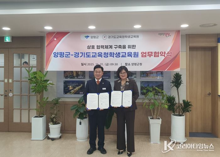 코리아타임뉴스 사회팀 | 경기도교육청학생교육원이 21일 양평군청(군수 전진선)과 미래형 교육환경 조성 및 지역 사회에 기반한 상호 협력체제 구축을 위한 업무협약을 체결했다.