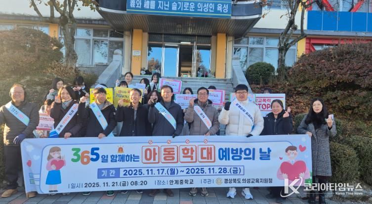코리아타임뉴스 사회팀 | 경상북도교육청 의성교육지원청은 2025년 11월 21일 오전, 안계중학교 정문 앞에서 아동 학대에 대한 경각심을 고취하고 학생들의 안전하고 행복한 생활을 위해 아동학대 예방 캠페인을 실시했다.