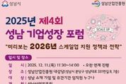 코리아타임뉴스 경기취재본부 | 성남산업진흥원은 '2026년 스케일업 지원 정책'을 주제로 오는 12월 11일 11시 30분부터 2025년 제4회 '성남기업성장포럼'을 개최한다. ‘성남기업성장포럼’은 2024년 9월 첫 포럼 개최 이후, 매회마다 참석자가 증가하여, 지난 10월 제3회 포럼에는 170여명의 기업 임직원과 10여개 기업지원기관이 참여하는 등 성남시 기업 성장을 위한 대표 네트워크로 성장하고 있다. 성남시 소재 기업 임직원은 누구나 포럼 참석이 가능하며, 성남산업진흥원 홈페이지를 통해 참석 신청을 할 수 있다. 이번 포럼에서는 '기업지원 미니설명회'에서 시니어 오너 기업의 엑시트(Exit) 전략에 대한 법무법인 지평의 발표에 이어 창업진흥원과 중소기업기술정보진흥원이 2026년 스케일업 지원방향과 주요 사업을 소개한다. 김윤정 창업진흥원 혁신사업화본부 본부장은 창업 초기단계와 성장단계 기업에 대한 내년도 지원 내용을 설명하고, 차인호 중소기업기술정보진흥원 사업총괄관리실 책임연구원은 중소기업 기술혁신(R&D)을 위한 주요 사업을 안내한다. 또한 성남시 소재 2개사가 자사의 기술과