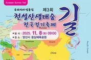 코리아타임뉴스 경남취재본부 | 양산시는 11월 8일 오전 9시 웅상체육공원에서 '제3회 천성산생태숲길 전국걷기축제'가 개최된다고 밝혔다. 이번 행사는 (사)양산도시문화연구원이 주최·주관하고, 양산시와 (사)한국걷는길연합이 후원한다. ‘유라시아의 첫길, 천성산에서 유라시아로 가다’를 주제로 열리는 이번 축제는 천성산의 아름다운 숲길을 걸으며 생태와 문화, 평화의 가치를 공유하는 전국 규모의 걷기 행사다. 특히 ‘천 가지 이야기를 품은 천성산’이라는 부제를 통해 천성산의 생태적 가치와 역사문화 자원을 널리 알리고 지역민의 자긍심을 고취하는 데 의미를 두고 있다. 행사는 천성산을 사랑했던 고(故) 허영호 대장을 기리며, 대한민국 대표 산악인 최오순 산악인과 함께 걷는 특별 프로그램이 마련돼 있다. 또 웅상체육공원을 출발해 천성산생태숲길 주요 구간을 걷는 4개 코스가 마련돼 있어 남녀노소 누구나 참여할 수 있다. 참가 신청은 양산도시문화연구원 홈페이지 또는 포스터의 QR코드를 통해 가능하다. 양산시 관계자는 “천성산생태숲길은 양산의 대표적인 자연생태자원이자 시민과 관광객 모두가 즐길 수 있는 힐링 명소”라