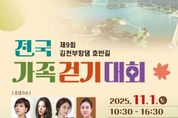 코리아타임뉴스 경북취재본부 | 김천시는 울긋불긋 가을빛으로 물든 부항댐 산내들공원 일원에서 오는 11월 1일 오전 10시 30분부터 오후 4시 30분까지 ‘제9회 김천부항댐 전국가족걷기대회’를 개최한다. 이번 대회는 남녀노소 누구나 부담 없이 참여할 수 있는 걷기 축제로, 5km 코스는 무료, 10km 코스는 참가비 1만 원으로 운영된다. 참가 신청은 홈페이지 ‘부항댐.kr’에서 사전 신청하거나 당일 현장 접수도 가능하다. 올해는 특히 어린 자녀를 둔 가족을 위해 ‘키즈 코스’와 ‘키즈존’이 새롭게 마련되어 걷기뿐 아니라 가족 소풍형 축제로 한층 풍성하게 진행된다. 키즈존에서는 에어바운스, 전통 놀이, 볼풀장 등이 상시 운영되며, 오후 1시와 2시 30분에는 버블쇼와 벌룬쇼 등 특별 이벤트가 열려 아이와 부모 모두 즐거운 시간을 보낼 수 있다. 무대에서는 참가자 노래자랑과 함께 한혜진, 제이린 등 인기 가수들의 축하 공연이 이어지는 ‘행복 콘서트’가 펼쳐져 현장 분위기를 한층 고조시킬 전망이다. 또한 ‘오삼이 캐릭터 잡기(선착순 100명)’, ‘쓰담쓰담’ 봉사활동, ‘걸음