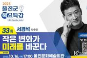 코리아타임뉴스 경북취재본부 | 울진군은 오는 10월 16일 오후 5시 후포면 울진문화예술회관에서 제33회 울진군 목요특강을 개최한다. 이번 특강은 방송인 서경석을 초청하여‘작은 변화가 미래를 바꾼다’라는 주제로 강연이 진행된다. 오랜 기간 방송 활동을 통해 국민과 소통하며 따뜻하고 유머러스한 화법으로 많은 사랑을 받아온 서경석 강사는 이번 강연에서 일상 속 작은 변화와 실천이 개인의 성장과 밝은 미래로 이어진다는 메시지를 군민들에게 전할 예정이다. 울진군 목요특강은 사전 신청 없이 무료로 관람할 수 있으며, 강연 후 현장에서 제공되는 만족도 조사 참여자와 사전질문 신청자 중 추첨을 통해 소정의 경품을 지급할 예정이다. 사전질문은 포스터에 안내된 QR코드를 통해 10월 1일부터 10일까지 신청할 수 있으며, 채택된 질문은 강연 중 서경석 강사가 직접 답변할 예정이다. 손병복 울진군수는 “이번 특강이 군민들에게 도전과 변화를 두려워하지 않는 긍정적인 메시지를 전할 것으로 기대한다”라며“많은 군민께서 함께하셔서 공감하고 웃으며, 미래를 준비하는 뜻깊은 시간이 되시길 바란다”라고 말했다. &n