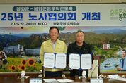 코리아타임뉴스 경북취재본부 | 봉화군은 봉화군과 봉화군공무직근로자 노사 양측 각각 4명의 위원이 참석한 가운데 지난 24일 군청 소회의실에서 2025년도 노사협의회를 가졌다고 밝혔다. 이날 회의에서는 지난 8월 공무직 근로자 측이 제시한 ‘8세 이하 자녀를 둔 공무직 근로자에게 연간 5일의 보육휴가 부여 안건’에 대해 심도 있게 논의해 합의를 도출했다. 박현국 봉화군수는 “이번 협의 결과가 일과 삶의 균형을 이루는 근무 환경을 조성하는 밑거름이 되기를 바란다.”며 “앞으로도 노사 간의 소통과 협력을 통해 상생의 노사 문화가 뿌리내리도록 최선을 다하겠다.”라고 말했다. 전종국 위원장도 “이번 협의를 통해 조합원들의 권리와 의무가 조화를 이루는 건강한 조직문화를 정착시키고, 노사가 함께 성장하는 발전적 관계를 이어가며 조합원과 군민 모두가 행복한 봉화를 만들기 위해 노력하겠다.”라고 화답했다.