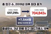 코리아타임뉴스 김택호 기자 | 천안시는 지난해 5월 총인구 70만 명을 돌파한 이후 증가세를 이어가며 2019년 이후 최대 인구 증가 기록을 경신했다고 15일 밝혔다. 지난해 12월 말 기준 천안시 총인구(외국인 포함)는 지난해 같은 기간보다 7,544명(1.1%) 늘어난 70만 4,843명으로 집계됐다. 이는 2019년 이후 연간 증가치 중 최대 증가한 수치로 분석된다. 천안시 총인구는 지난해 5월 70만 403명을 기록한 이후 7월(785명), 9월(1,088명), 10월(666명) 등 매월 꾸준한 증가세를 보였다. 특히 9월에는 한 달 사이 1,000명 이상이 늘어나며 증가세가 가장 두드러졌다. 인구 통계적 지표 개선도 눈에 띈다. 지난해 출생아 수(3,711명)가 사망자 수(3,591명)를 앞지르며 3년 만에 ‘인구 데드크로스’를 극복했다. 천안시는 출산 친화적 사회분위기 확산을 위해 ▲7남매 다둥이 맘인 김소정 씨 출산장려 홍보대사 위촉 ▲출산장려 릴레이 캠페인 전개 ▲초중고 및 읍면동 찾아가는 인구교육 확대 운영 등 시민 인식제고 활동도 함께 추진해 정책효과를 높였다. 시는