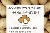 코리아타임뉴스 김택호 기자 | 당진시는 오는 3월 3일 오후 1시 30분 당진시농업기술센터 중강의실에서 씨감자 추백 재배 농가 및 교육 희망자 50여 명을 대상으로 ‘우량 씨감자 안정 생산을 위한 재배기술 교육’을 실시한다고 24일 밝혔다. 이번 교육은 건전한 씨감자 생산을 위한 재배 환경 관리와 병해충·바이러스 방제 기술을 전수하고, 종서 생산 단계별 표준 재배 기술 정립 및 품질 균일화를 위해 진행한다. 특히 교육에는 충청남도 스마트농업본부 종자산업과의 조만현 박사가 강사로 나서 전문성 높은 강의를 한다. 주요 교육 내용은 재배 환경 관리 요령 등이며, 실제 영농 현장에서 겪는 애로사항에 대한 질의응답을 통해 실질적인 해결 방안을 제시할 예정이다. 한편, 당진시는 충청남도 스마트농업본부와 연계해 조직배양 기반의 ‘추백’ 씨감자를 체계적으로 생산·공급했으며, 바이러스 무병 씨감자 망실재배 시범 사업을 도입해 건전 종서를 안정적으로 생산하기 위해 노력해 왔다. 농업기술센터 관계자는 “씨감자는 지역 감자 산업의 경쟁력을 좌우하는 핵심 자원”이라며, “이번 교육을 통해 건전 종서 생산기술을 농가에 체계