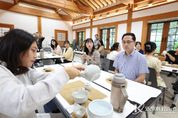 코리아타임뉴스 대전취재본부 | 대전 동구는 13일 이사동 유교전통의례관 대전별서에서 관내 어린이집 영유아 부모를 대상으로 전통 다도와 향 체험을 결합한 ‘차향유정(茶香有情) 차와 향기를 나누다’ 프로그램을 운영했다고 밝혔다. 이번 프로그램은 육아로 지친 부모들이 바쁜 일상 속에서 잠시나마 자신을 돌보고 내면의 평온을 되찾을 수 있도록 기획된 힐링 프로그램으로, 총 3회에 걸쳐 운영될 예정이다. 첫 회차인 이날 체험에는 박희조 동구청장을 비롯해 영유아 부모 20여 명이 참여해 전문 강사의 지도 아래 차를 우리고 마시는 전통 다도 예절을 배우고, 전통 향을 활용한 명상 활동을 통해 감각을 깨우며 마음을 다스리는 시간을 가졌다. 특히, 단순한 체험을 넘어 전통문화의 정취를 느끼고 바쁜 육아 생활 속에서 마음의 여유를 되찾는 의미 있는 시간으로 꾸며져 참여자들의 큰 호응을 얻었다. 박희조 동구청장은 “이번 다도체험을 통해 부모님들이 짧지만 깊은 쉼 속에서 마음의 여유를 되찾는 시간이 됐길 바란다”며 “앞으로도 전통문화를 쉽고 친근하게 접할 수 있는 다양한 프로그램을 지속적으로 발굴해 나가겠다”고 말했다.