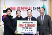 코리아타임뉴스 대전취재본부 | 명원타올(석영일 대표)은 12일 오전 8시30분, 대전시청 10층 응접실에서 타올 5,000장(5천만 원 상당)을 대전사랑시민협의회에 기탁했다. 이날 기탁식에는 이장우 대전시장, 남재동 대전사랑시민협의회 회장, 석영일 명원타올 대표 등이 참석했다. 이번에 기탁된 물품은 대전 관내 취약계층(장애인, 독거노인 등)에 전달될 예정이다.