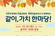 코리아타임뉴스 문화팀 | 가평군은 오는 18일 오전 10시부터 오후 3시까지 음악역 1939 광장에서 주민과 함께하는 축제 ‘2025년 같이, 가치 한마당’을 연다. 이번 행사는 사회적경제기업의 판로 확대와 마을공동체, 경기행복마을관리소의 활동 성과를 알리고 주민 참여를 확대하기 위해 마련됐다. 행사에는 사회적경제기업 5곳, 마을공동체 16곳, 경기행복마을관리소 4곳 등 총 25개 단체가 참여한다. 이날 주민들은 현장에서 직접 사회적경제기업의 제품을 구매할 수 있으며, 공동체별 특색 있는 프로그램을 즐길 수 있다. 주요 프로그램은 △사회적경제기업 생산품 홍보·판매 △공동체와 경기행복마을관리소 활동 전시 및 무료 체험 △합창·뮤지컬 갈라쇼·힐링체조 등 공연 △경품 이벤트 등이 마련돼 있다. 특히 가평마을교육공동체가 제작한 단편영화 상영 등 주민 주도 콘텐츠도 선보일 예정이다. 가평군 관계자는 “‘같이, 가치 한마당’ 축제를 통해 지역사회에서 사회적경제와 공동체 활동이 더욱 확산되기를 기대한다”며 “이번 행사가 지역경제의 활력으로 이어질 수 있도록 주민 여러분의 많은 방문과 성원을 부탁드린다”고 말했다