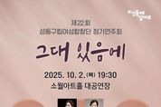 코리아타임뉴스 박찬식 기자 | 서울 성동구는 오는 10월 2일 저녁 7시 30분 소월아트홀에서 성동구립 여성합창단 '제22회 정기 공연'을 개최한다고 밝혔다. 공연 부제는 '그대 있음에'로 가을밤, 구민들에게 사랑과 위로의 하모니를 선사할 예정이다. 1991년 창단한 성동구립 여성합창단은 성동구를 대표하는 문화사절단으로, 2025년 제3회 남도전국합창대회 대상 수상 등 다수의 외부 무대에서 실력을 인정받고 있다. 올해 제22회 정기공연은 구민들에게 수준 높은 문화예술 향유 기회를 제공하고, 합창단원 간의 화합을 다지는 특별한 자리로 마련됐다. 특히 이번 공연에는 테너 신지한과 감성 클래식 앙상블 ‘아우름 트리오’가 협연진으로 무대에 올라, 한층 풍성한 음악적 감동을 선사할 예정이다. 또한, 합창단의 진한 감성을 느낄 수 있는 ‘그대 있음에’를 비롯해 제주 바다의 정취를 전달하는 ‘이어도사나’ 등 아름다운 합창과 더불어, 세계적으로 사랑받는 ‘리베르탱고’, ‘10월의 어느 멋진 날’에 등 클래식과 대중음악 등 다채로운 무대를 선보일 예정이다. 정원오 성동구청장은 “깊어가는 가을밤, 멋진 하모니로 일상