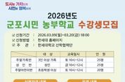 코리아타임뉴스 사회팀 | 군포시 도시농업 활성화 지원사업 보조사업자인 한세대학교가 오는 3월 20일까지 2026년도 군포시민 농부학교 신규 수강생을 모집한다고 밝혔다. 군포시민 농부학교는 군포시민들이 도심 속에서 직접 작물을 재배하며 친환경적인 삶의 태도를 함양하고, 이웃과 소통하는 공동체 문화를 회복하기 위해 마련됐다. 특히 단순한 농사 기술 습득을 넘어 이론과 실습이 병행된 체계적인 커리큘럼을 제공할 예정이다. 올해 모집 규모는 성인반 25구좌, 주말가족반 25구좌, 주말어린이반 20구좌로 총 70구좌이며, 교육은 한세대학교 내 위치한 도시농업지원센터 전용 농장에서 진행된다. 운영 기간은 3월부터 12월까지 약 10개월간이며 총 20강에 걸쳐 절기별 작물 재배법과 생태 교육 등 다채로운 프로그램이 이어진다. 신청 접수는 3월 9일부터 3월 20일까지 진행되며 자세한 커리큘럼 및 접수 방법은 한세대학교 홈페이지 공지사항을 통해 확인할 수 있다. 군포시 관계자는 “도시농업은 먹거리를 생산하는 즐거움을 넘어 기후 위기 시대에 탄소 중립을 실천하는 소중한 발걸음이 될 것”이라며 “많은 시민이 흙을 만지