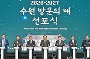 코리아타임뉴스 사회팀 | 이재준 수원특례시장이 24일 수원컨벤션센터에서 열린 ‘2026-2027 수원 방문의 해’ 선포식에서 “수원의 문을 세계로 활짝 열겠다”고 말했다. 이재준 시장은 기념사에서 “수원 방문의 해는 수원의 가치를 세계와 나누겠다는 가슴 벅찬 선언”이라며 “수원은 케이(K)-콘텐츠를 선도하고, 한국 방문 관광객 2000만 명 시대를 견인할 역량이 충분한 도시”라고 밝혔다. 이어 “수원은 세계가 주목하는 ‘글로벌 문화관광 도시’가 될 수 있다”며 “희망찬 여정에 시민 모두가 도시의 주인이라는 마음으로 함께해 주시길 바란다”고 말했다. 이날 선포식은 수원 방문의 해 로고 기수단 입장으로 시작됐다. 이재준 수원시장과 산하기관·관광업계·시민단체 대표 30명이 기수로 참여했다. 수원시는 수원화성 축성 230주년(2026년), 수원화성 유네스코 세계문화유산 지정 30주년(2027년)을 맞아 수원 방문의 해를 선포했다. 슬로건은 ‘수원, 당신을 위한 관광도시(Suwon For You)’다. 연간 1500만 명이 찾는 글로벌 관광도시를 발돋움하는 것을 목표로 설정했다. 수원 방문의 해