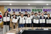 코리아타임뉴스 사회팀 | 대전시교육청은 2월 24일 오후 3시, ‘2026년 학교로 찾아가는 예술무대’의 원활한 추진을 위해 20개 예술단체와 업무협약을 체결했다. 이번 협약은 지역 예술인과의 긴밀한 협력을 바탕으로 학교예술교육의 내실을 다지고, 학생들에게 문화예술을 향유할 수 있는 기회를 확대하기 위해 마련됐다. '학교로 찾아가는 예술무대'는 2015년 음악공연 중심의 ‘찾아가는 음악회’로 시작해 2018년 미술·무용·연극 등으로 분야를 확대하면서 현재의 사업명칭으로 변경됐으며, 2025년까지 총 636교에서 예술 공연을 실시했다. 2026년에는 초·중·고 120교를 대상으로 총 2억 1,600만원의 사업비를 지원하여 운영할 계획이다. 오페라, 퓨전국악, 클래식 앙상블, 창작뮤지컬, 연극, 전통예술 등 다양한 장르의 공연을 통해 학생들에게 폭넓고 수준 높은 예술체험 기회를 제공할 예정이며, 단순한 관람을 넘어 예술가와 직접 소통하면서 예술의 즐거움을 체험할 수 있는 참여형·체험형 프로그램을 강화해 운영할 방침이다. 대전오페라단 지은주 대표는 “학교로 직접 찾아가 학생들과 가까이에서 호