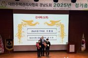 코리아타임뉴스 오영주 기자 | 대한주택관리사협회 경남도회는 어제(11월 27일) 창원축구센터 대세미나실에서 2025년 정기총회를 열고 공동주택 관리 발전에 기여한 공로로 경상남도 및 양산시, 올해 우수 주택관리사와 공로자 등 20여명에 대해 표창 및 감사패를 수여했다. 대한주택관리사협회는 양산시의 공동주택 행정의 체계적 개선 노력을 인정해 변기호 공동주택과장에게 감사패를 수여했다. 협회는 공동주택 거주비율이 80%를 넘는 지역 특성에 맞춰 시가 지속적으로 관리 역량을 강화해 온 점을 높게 평가했다. 양산시는 관리주체를 대상으로 한 직무교육을 정례화해 관리 전문성을 높이고 경남도 내 지자체 최초로 공동주택관리지원센터팀을 신설해 직접 찾아가는 컨설팅을 확대했으며, 분야별 전문가로 구성된 자문단을 운영해 현장 맞춤형 지원을 제공했다. 또 관리 전반의 투명성 강화를 위해 공동주택 관리 감사제도를 적극 활용해 공동주택 내 예산집행, 입주자대표회의 운영 등 핵심 영역을 점검해 분쟁을 예방하고 단지별 관리 수준을 끌어올리는데 기여하고 감사 결과를 토대로 개선이 필요한 단지에는 추가 컨설팅을 연계해 문제해결을 지