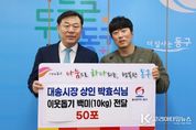 코리아타임뉴스 울산취재본부 | 울산 동구 대송시장에서 식품유통업체를 운영하고 있는 new캐슬장터 박효식 대표가 1월 28일 오전 11시 10분 동구청을 방문해 시가 200만원 상당의 쌀(10kg) 50포를 전달했다. 박효식 대표는 평소 시장을 찾아주는 지역 주민들에게 감사의 마음을 전하고, 어려운 이웃을 돕는 데 동참하기 위해 쌀 50포를 기탁했다. 이날 전달된 성품은 대송동 지역의 저소득층을 돕는 데 사용될 예정이다.