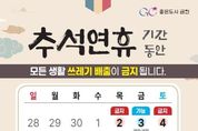 코리아타임뉴스 윤광희 기자 | 금천구는 추석 연휴 기간 생활쓰레기(일반생활쓰레기, 음식물쓰레기, 재활용품) 수거를 일시 중단한다고 밝혔다. 환경미화원들의 휴식권을 보장하고 안전한 근무 환경을 조성하기 위한 조치라고 구는 설명했다. 수도권매립지관리공사와 청소대행업체도 휴무다. 이에 따라 주민들은 10월 3일과 7일, 9~10일 오후 6시부터 자정까지 대형생활폐기물을 제외한 모든 생활쓰레기를 배출할 수 있다. 연휴 기간 중 생활쓰레기 배출이 금지되는 날은 2일과 4~6일, 8일, 11일이다. 구는 쓰레기배출이 일시 중단됨에 따라 주민 불편을 최소화하기 위한 청소상황실과 청소대행업체 기동반을 편성·운영한다. 쓰레기 관련 민원에 신속히 대응할 방침이다. 또한 연휴가 끝나는 10일부터는 인력과 장비를 총동원해 적체된 쓰레기를 일제 수거할 계획이다. 유성훈 금천구청장은 "평소에 묵묵히 금천의 청결을 책임지고 있는 환경미화원 분들께 감사드린다“라며 ”추석 연휴 기간 쓰레기 배출일을 꼭 확인하시어, 서로 배려하고 즐거운 명절을 보낼 수 있도록 주민 여러분의 많은 이해와 적극적인 참여를 부탁드린다”라고