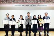 코리아타임뉴스 윤광희 기자 | 파주시는 지난 3일, ‘지혜의 숲’대회의실에서 '2025년 지역사회보장협의체 성과공유회’를 개최했다. 이번 행사에는 대표협의체, 실무협의체, 분과위원, 읍면동 협의체 위원 등 150여 명이 참석했으며, 공공위원장 김경일 시장과 민간위원장 이보경 위원장이 공동으로 주관했다. 올해 성과공유회는 ‘함께라서 빛났던 2025년, 반짝이며 나아갈 2026년’을 주제로, 한 해 동안 지역 복지를 위해 헌신한 협의체 활동을 돌아보고, 현장의 성과를 확산하기 위한 취지로 마련됐다. 행사 전 참여자들이 작성한 붙임쪽지는 행사장 앞 성탄절 나무에 장식되어, 각자의 바람과 격려가 하나의 공동체적 상징으로 모아졌다. 성탄절 나무 쪽지 걸기 시연회는 올 한 해 서로 간에 다져온 협력의 의미를 되새기고, 다가오는 2026년을 향한 희망을 함께 공유하는 시간으로 이어졌다. 1부 행사에서는 협의체 위원 소개와 함께 유공자 24명 및 특화사업 우수 읍면동 3개소에 대한 표창이 진행됐으며, 공동위원장 두 명의 기념사를 통해 한 해의 활동을 마무리하는 알림말(메시지)이 전해졌다. 이어 활동 영상 상영,