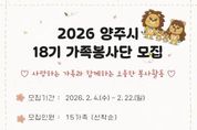 코리아타임뉴스 윤광희 기자 | 양주시자원봉사센터는 가족이 함께 참여하는 자원봉사 활동을 통해 건강한 가족문화를 조성하고 지역사회 나눔을 실천하기 위해 가족 단위로 함께 참여하는 ‘18기 가족봉사단’을 모집한다고 밝혔다. 모집대상은 양주시에 거주하는 2인 이상 가족으로 월 1회 정기적인 봉사활동 참여가 가능한 가족이며 총 15가족을 선착순 모집한다. 가족봉사단은 부모와 자녀가 함께 봉사활동에 참여하며 생활 속 나눔을 실천하는 참여형 프로그램으로 단순한 봉사활동을 넘어 가족 간 소통과 협력을 통해 유대감을 높이고 공동체 의식을 함양하는 데 목적이 있다. 제 18기 가족봉사단은 3월 발대식을 시작으로 ▲환경정화 활동 ▲계절별 나눔 활동 ▲재난안전체험 ▲시설봉사활동 ▲고구마경작활동 ▲시 축제 홍보부스 운영 등 매월 셋째 주 토요일마다 월·테마별 활동에 참여할 예정이다. 양주시자원봉사센터 이정주 센터장은 “가족이 함께 봉사활동에 참여하는 경험은 자녀에게 나눔의 가치를 자연스럽게 전달하고, 가족 간 유대감을 강화하는 계기가 된다.”며 “지역사회에 따뜻한 변화를 만들어갈 가족들의 많은 관심과 참여를 바란다.”고