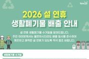 코리아타임뉴스 윤광희 기자 | 양주시가 설 연휴 기간 시민과 방문객의 불편을 줄이기 위해 ‘2026년 설 연휴 생활폐기물 관리 대책’을 추진한다. 양주시는 설 연휴가 시작되는 오는 2월 14일부터 18일까지를 특별 관리 기간으로 정하고, 연휴 기간 중 급증하는 생활폐기물로 인한 불편을 최소화할 방침이다. 시는 종량제봉투, 음식물류 폐기물, 재활용품 등 생활폐기물을 2월 14일과 16일 이틀간 정상 수거한다. 공동주택에서 발생하는 음식물류 폐기물은 2월 18일 별도 수거해 연휴 기간 배출된 폐기물이 장기간 방치되는 것을 막을 계획이다. 또 연휴 기간 중 쓰레기 민원과 긴급 상황에 신속히 대응하기 위해 상황근무반을 편성하는 등 비상 청소체계를 구축·운영한다. 양주시 관계자는 “설 연휴 기간 생활폐기물 발생을 줄이기 위한 시민들의 적극적인 협조가 필요하다”며 “생활폐기물은 정해진 수거 일정에 맞춰 배출해 주시고, 수거일 전날 오후 8시부터 수거일 당일 오전 6시까지 배출 시간을 반드시 지켜달라”고 당부했다.
