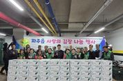 코리아타임뉴스 윤광희 기자 | 파주시 파주읍 새마을부녀회와 새마을지도자협의회는 지난 11일, 겨울을 앞두고 지역 내 어려운 이웃을 위한 ‘사랑의 김장김치 나눔 행사’를 실천했다고 밝혔다. 이날 행사는 새마을부녀회원들과 지도자협의회원들이 이틀에 걸쳐 협력해 진행됐다. 전날인 10일에는 배추 절이기와 재료 손질 등 사전 준비를 진행했으며, 11일에는 본격적으로 속 넣기와 포장 작업을 이어가며 정성껏 김치를 담갔다. 완성된 김장김치 119상자는 새마을부녀회원이 관내 저소득 독거 어르신 가정에 직접 방문하며 전달해 따뜻한 정성을 전했다. 이선희 파주읍 새마을부녀회장은 “회원들과 함께 마음을 모아 담근 김치가 이웃들에게 힘이 되길 바란다”라며 “앞으로도 여성의 섬세한 손길로 지역 나눔을 실천하겠다”라고 전했다. 변봉수 파주읍 새마을지도자협의회장은 “지역사회가 함께 나누고 배려할 때 더 따뜻해진다”라며 “작은 정성이지만 이웃들에게 힘이 되길 바란다”라고 말했다. 윤상기 파주읍장은 “매년 이어지는 김장김치 나눔 행사는 지역 공동체의 온정을 느낄 수 있는 소중한 자리”라며 “앞으로도 민관이 협력해 복